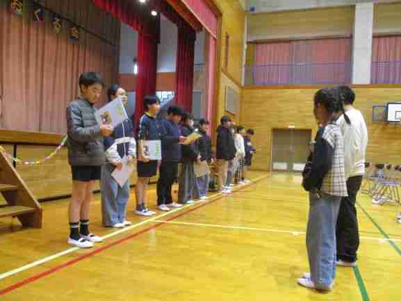 なわとび集会を実施しました。高学年児童が模範演技を行いました。